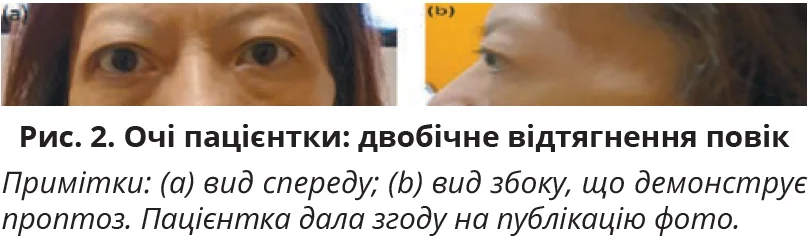Під час обстеження було виявлено тахікардію (146 ударів на хвилину) та тахіпное (28 дихальних рухів на хвилину). Решта показників життєдіяльності були нічим не примітними. У пацієнтки спостерігалися двобічний легкий проптоз і ретракція повік, але не було хемозу чи диплопії (рис. 2).