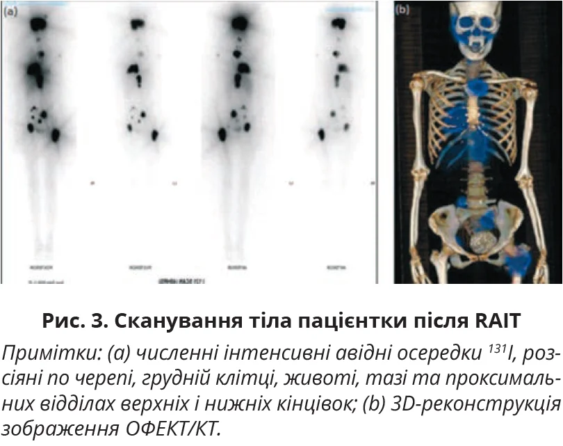 Після RAIT сканування всього тіла (WBS) показало численні інтенсивні фокуси 131I, розсіяні по черепі, грудній клітці, животі, тазі та проксимальних відділах верхніх і нижніх кінцівок (рис. 3a), що відповідає місцям метастатичного захворювання на однофотонній емісійній КТ (ОФЕКТ)/КТ (рис. 3b).