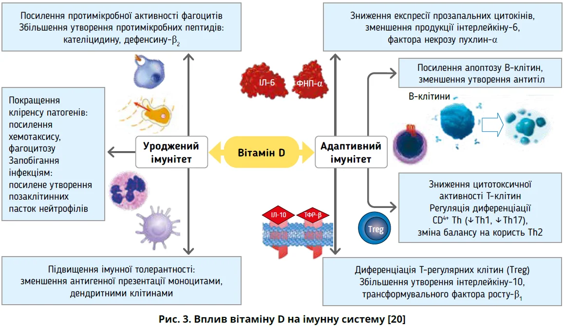 Імуномодулювальний ефект вітаміну D (рис. 3) полягає у впливі на дозрівання макрофагів, диференціацію моноцитів, посилення фагоцитозу й хемотаксису та протипухлинні впливи мононуклеарних макрофагів.