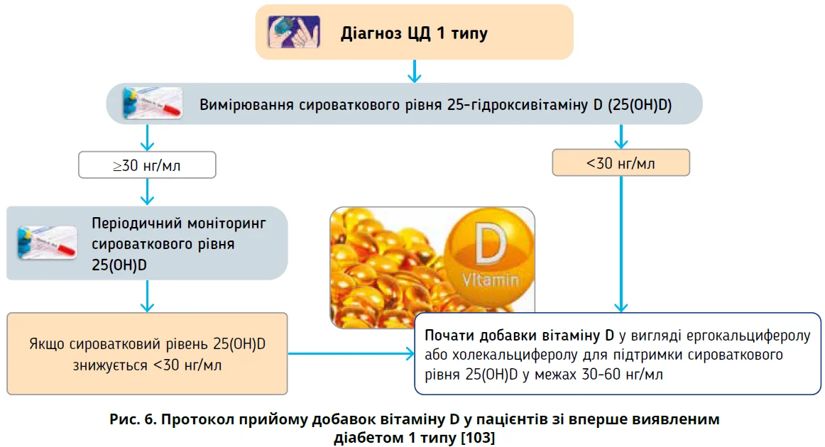 Дослідження, в яких використовували малі дози вітаміну D, повідомляли про незначущий вплив на часткову ремісію ЦД 1 типу [98, 100]. Дослідження на тваринах і клінічні випробування свідчать, що для реалізації позаскелетних ефектів вітаміну D потрібні високі дози [101, 102]. Нещодавно проведено РКД за участю 36 дітей і підлітків, яких рандомізували до прийому вітаміну D2 (ергокальциферол 50 000 МО на тиждень протягом 2 місяців, надалі через тиждень протягом 10 місяців) або плацебо. У групі застосування вітаміну D виявлено суттєве зменшення часового підвищення рівня глікованого гемоглобіну (НbA1c) із середньою швидкістю змін за 3 місяці 0,14% проти 0,46% у групі порівняння (p=0,044). HbA1c з поправкою на дозу інсуліну також був істотно меншим у групі застосування вітаміну D (середня швидкість змін за 3 місяці 0,30% проти 0,77% у групі порівняння; p=0,015). Дослідники рекомендують протокол застосування вітаміну D після встановлення діагнозу ЦД 1 типу та початкової оцінки концентрації 25(OH)D у сироватці крові (рис. 6) [103].
