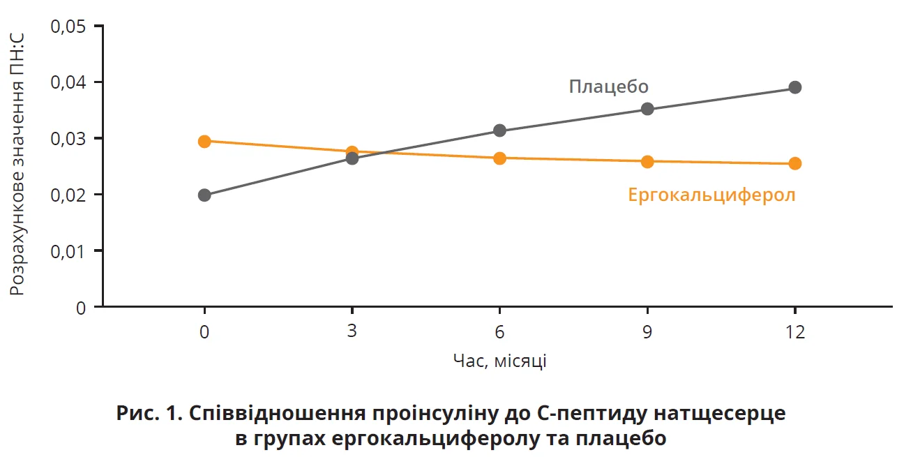 Додавання вітаміну D покращувало здатність β-клітин до секреції інсуліну, що спостерігалося за зниженням середнього співвідношення ПН: C порівняно з плацебо (рис. 1).