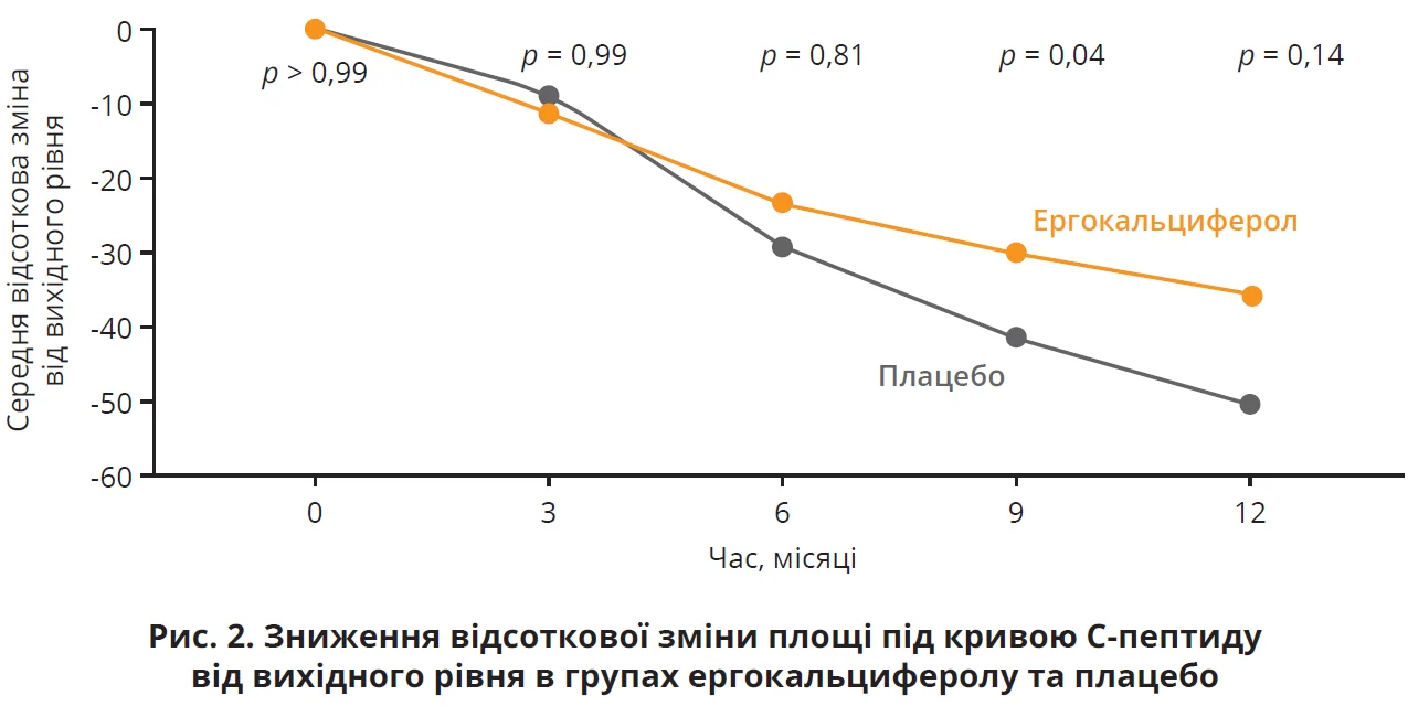 Зниження відсоткової зміни площі під кривою C-пептиду від вихідного рівня було помітно повільнішим із вітаміном D, ніж у групі плацебо, що вказує на тривалішу затримку втрати С-пептиду (рис. 2).