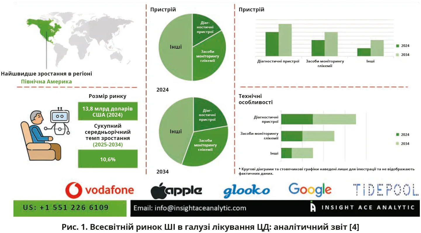 Виявляється, у 2024 р. розмір всесвітнього ринку ШІ в галузі діагностики та лікування ЦД оцінювався в 13,8 млрд доларів США, який, за прогнозами, матиме вагомий середньорічний темп зростання (10,6%), завдяки чому у 2034 р. досягне 32,4 млрд доларів США [4].