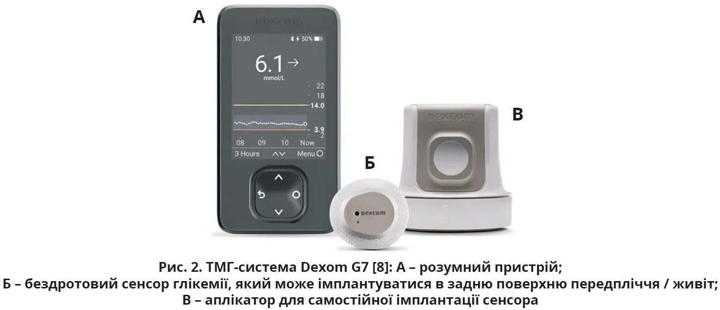 Найвідомішою ТМГ-системою є Dexcom G7, яка отримала дозвіл FDA та європейських регуляторних органів для використання в осіб від 18 років [8]. Dexcom G7 позиціонується як найточніша глюкометрична система, бездротовий сенсор якої можна носити протягом 10 діб без підзарядки (рис. 2); очікується, що в другій половині 2025 р. на фармацевтичних ринках з’явиться нова модифікація цього пристрою, яку можна буде використовувати протягом 15 діб без додаткового заряджання. ТМГ-система від Dexcom інтегрована з мобільним застосунком Sugarmate, що синхронізує показники глікемії з рівнем активності на всіх мобільних пристроях пацієнта в режимі реального часу та надає персоналізовані рекомендації [15]. За прогнозами, саме Dexcom G7 буде основним гравцем у галузі ТМГ-систем, а його найближчий конкурент – FreeStyle Libre 2/3 (виробник – Abbott Laboratories, США), який має свій власний застосунок LibreLink і хмарний сервіс LibreView, поки що поступається Dexcom G7 у точності вимірювання рівня глікемії [4].