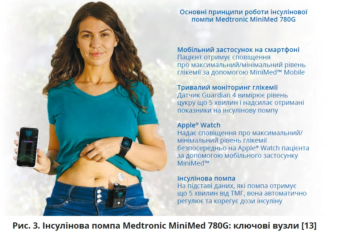 Як яскравий приклад комбінації ТМГ-системи й інсулінової помпи можна навести системи Medtronic MiniMed 780G та Tandem t:slim X2 з Control-IQ, які схвалені FDA. Medtronic MiniMed 780G автоматично регулює введення базального інсуліну з огляду на дані ТМГ (рис. 3) [14]. Це озна­чає, що помпа автоматично отримує дані про рівень глікемії із сенсора та трансмітера Guardian 4, потім уводить інсулін з різною базальною швидкістю протягом 24 годин, ґрунтуючись на індивідуальних потребах / активності пацієнта. Така інтегрована система ШІ, де помпа та ТМГ «спілкуються» між собою, допомагає стабілізувати рівень глікемії та скоротити кількість гіпер- і гіпоглікемічних епізодів.
