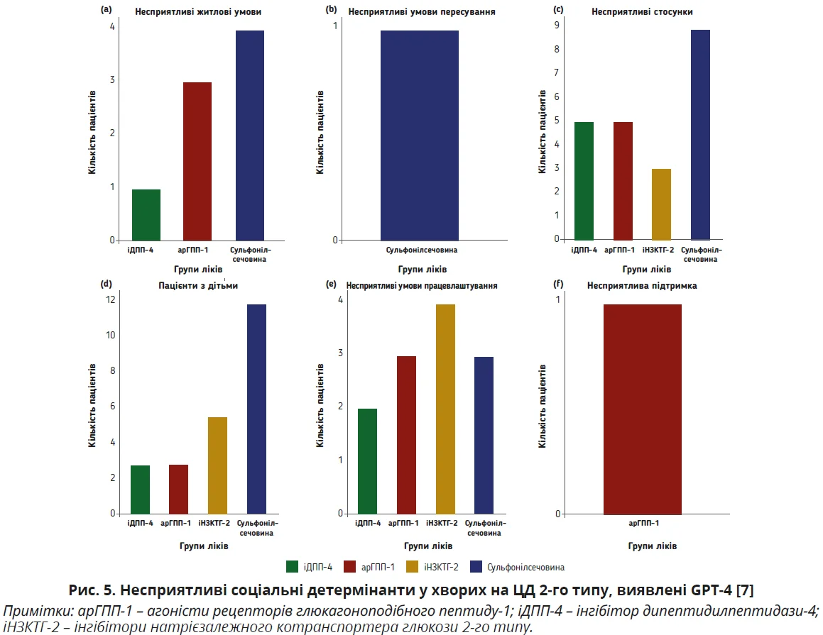В іншому обсерваційному дослідженні, яке було проведене в реальних клінічних умовах, спостерігали за 9 млн пацієнтів і намагалися оцінити соціальні диспропорції в призначенні терапії другої лінії хворим на ЦД 2-го типу. Дизайн випробування припускав застосування GPT-4 для аналізу 270 клінічних записів щодо стану 105 пацієнтів з метою визначення несприятливих соціальних детермінант для здоров’я в 6 галузях: транспорт (відстань, ресурси), житло (власне, бідне, бездомний), стосунки (одружений, має партнера, розлучений, вдівець, самотній), пацієнти з дітьми, підтримка (наявна, відсутня) та зайнятість (повна, неповна, безробітний, інвалідність, пенсіонер, студент) [7]. Виявлені несприятливі фактори об’єднали в категорії: «Несприятливі умови пересування», «Несприятливі житлові умови», «Несприятливі стосунки», «Пацієнти з дітьми», «Несприятлива підтримка» та «Несприятливі умови працевлаштування». Виявлені несприятливі фактори дослідники запропонували GPT-4 представити у вигляді графіків залежно від класу гіпоглікемічних засобів, які отримували хворі, й отримали ось такі результати (рис. 5).