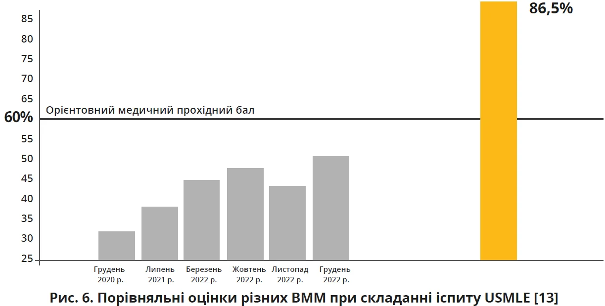 Відносно нещодавно з’явилася інша ВММ – Med-PaLM від Google. На відміну від GPT-4, Med-PaLM створювалася на базі сімейства базових моделей MedLM, які від самого початку розроблялися саме для використання в галузі охорони здоров’я. На цей час Med-PaLM є першою та поки що єдиною системою ШІ, яка перевищила прохідний бал (>60%) при проходженні медичного ліцензійного іспиту США (USMLE) [13]. Зазвичай запитання в стилі USMLE являють собою опис клінічної ситуації з наданням скарг пацієнта, результатів аналізів та інструментальних досліджень, на підставі яких потрібно встановити ймовірний діагноз, призначити необхідні додаткові дослідження та лікування. Med-PaLM стала першою системою ШІ, яка успішно склала іспит USMLE й отримала прохідний бал 67,6%, оновлена версія Med-PaLM 2 покращила цей показник і здобула оцінку 86,5% (рис. 6) [13].