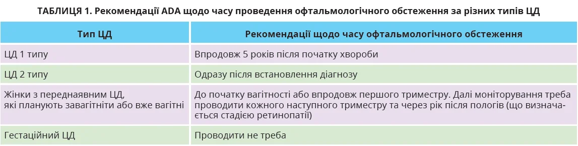 et al., 2018) й Американської діабетичної асоціації – ADA (як частина програмної заяви з ДР; Solomon S. et al., 2017). Перше обстеження ока ADA рекомендує проводити вкрай ретельно. Час його здійснення визначається типом ЦД (табл. 1). Обсяг офтальмологічного обстеження за рекомендаціями ICO й ADA дещо відрізняється (табл. 2).