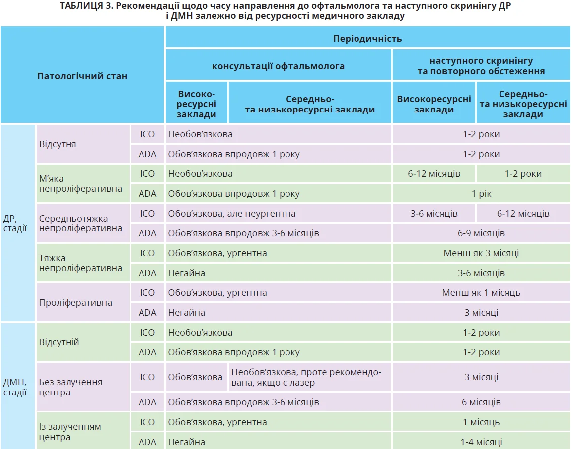 Час наступних візитів для скринінгу й офтальмологічної консультації залежно від ресурсності закладу наведено в таблиці 3.