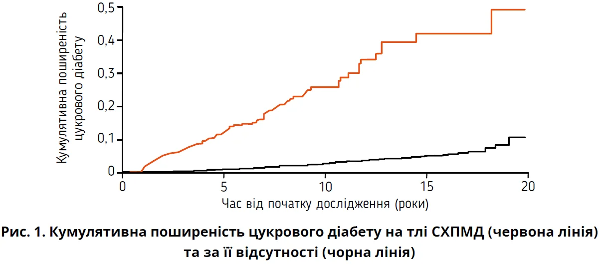 СХПМД включає цілий спектр нозологій від стеатозу до стеатогепатиту, цирозу та гепатоцелюлярної карциноми (Chalasani N. et al., 2012). Очікується, що до 2030 р. СХПАМД уразить майже 1/3 загальної популяції світу (Estes C. et al., 2018). Патогенез СХПМД у наш час розглядається крізь призму теорії «множинних ударів» (multiple hit theory), яка ґрунтується на синергетичній ролі генетичних та епігенетичних чинників, включаючи інсулінорезистентність, окисний стрес, дисбіоз кишківника тощо (Marchisello S. et al., 2019). Стан печінки й наявність СХПМД вважають своєрідним «барометром метаболічного здоров’я», що підкреслює важливість контролю за станом печінки, метаболічними розладами й асоційованою з ними ендокринною дисфункцією (Tutunchi H. et al., 2020; Nobili V. et al., 2013). Зв’язок СХПМД з різними ендокринними хворобами ретельно вивчався та продовжує вивчатися, і станом на сьогодні відомо, що ендокринопатії є чинниками ризику виникнення, прогресування й тяжкого перебігу СХПМД (Hazlehurst J.M., Tomlinson J.W., 2013). Експериментальні та клінічні дослідження однозначно підтвердили зв’язок СХПМД із синдромом полікістозних яєчників, гіпопітуїтаризмом, дефіцитом гормону росту, гіпогонадизмом та іншими ендокринними патологіями (Arefhosseini S. et al., 2022). СХПМД також тісно асоціюється з розвитком цукрового діабету 2-го типу (рис. 1) (Park S.H. et al., 2023).