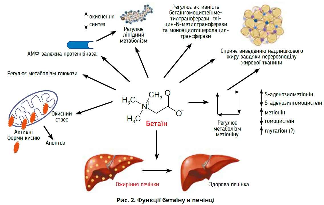 Зокрема, показано, що бетаїн покращує перебіг СХПМД і зменшує асоційовану з нею печінкову інсулінорезистентність, забезпечуючи гепатопротекцію. Бетаїн є сполукою природного походження, що трапляється в продуктах харчування та синтезується in vivo з холіну. В умовах живого організму бетаїн виступає донором метильних груп у процесі перетворення гомоцистеїну на метіонін, а також діє як осмоліт (Kathirvel E. et al., 2010). Функції бетаїну в печінці є надзвичайно багатогранними (рис. 2) (Arumugam M.K. et al., 2021).