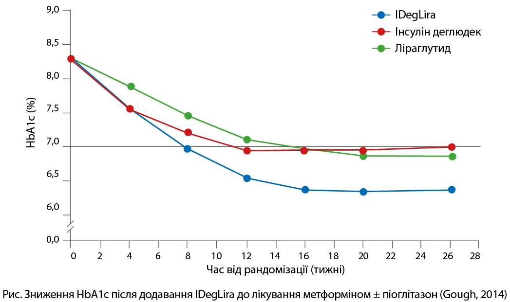 DUAL І було найпершим дослідженням, результати якого довели доцільність і безпечність застосування фіксованої комбінації порівняно з окремим уведенням ін’єкцій інсуліну деглюдек і ліраглутиду в разі неефективності ПЦЗ. Дослідження проводилося в 19 країнах світу за участі 1663 пацієнтів із незадовільним контролем вуглеводного обміну на тлі прийому метформіну з/без піоглітазону. У дослідженні фіксовану комбінацію IDegLira порівнювали з додаванням однієї з двох його активних речовин – інсуліну деглюдек або ліраглутиду. Середній рівень HbA1c, який становив 8,3% на початку, знизився до 6,4% після 26 тижнів лікування IDegLira порівняно з 6,9% і 7,0% відповідно при застосуванні інсуліну деглюдек або ліраглутиду (рис.).