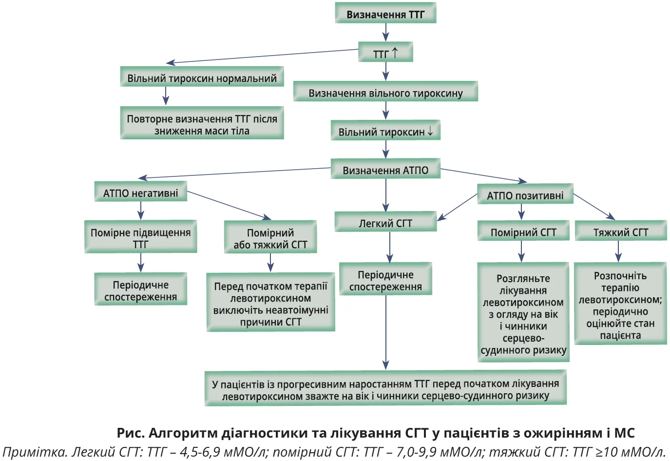 У минулому препарати тиреоїдних гормонів активно використовувалися для лікування ожиріння, але нині така тактика не підтримується через ризик ятрогенного тиреотоксикозу й асоційованих із ним аритмій, серцевої недостатності чи ішемічних подій. Відповідно до рекомендацій Європейського товариства ендокринологів (2020) і Американської тиреоїдної асоціації (2014) пацієнти з ожирінням та ізольованим підвищенням ТТГ на тлі нормального рівня вільного тироксину не мають отримувати левотироксин із метою зниження ваги. Натомість лікування левотироксином слід розпочинати в осіб з ожирінням, особливо молодих пацієнтів і жінок фертильного віку, в яких було діагностовано СГТ, асоційований з автоімунними процесами в ЩЗ, або за наявності первинного гіпотиреозу (після лікування радіоактивним йодом, часткової тиреоїдектомії, деструктивного тиреоїдиту). Пероральна монотерапія левотироксином є ефективним способом лікування тяжкого СГТ і клінічно вираженого гіпотиреозу (рис.).