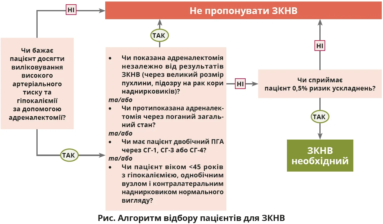 Основна передумова – ЗКНВ використовується для субтипування, а не підтвердження діагнозу ПГА, тобто перед ЗКНВ має бути встановлено беззаперечний біохімічний діагноз ПГА. Враховуючи обмежену доступність і вартість ЗКНВ, потрібний ретельний відбір кандидатів на загальну анестезію й операцію (алгоритм відбору пацієнтів наведено на рисунку).