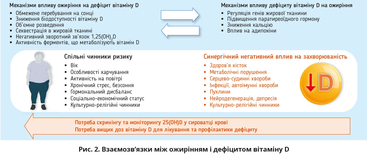 Дані масштабних обсерваційних досліджень, зокрема Фремінгемського, свідчать, що ожиріння асоціюється з підвищеним ризиком гіповітамінозу D [16]. Метааналіз даних 23 обсерваційних досліджень вивчав поширеність ДВD (25(OH)D <50 нмоль/л) у групах учасників з ожирінням, надлишком маси тіла (ІМТ – 25-29,99 кг/м2) і нормальною масою тіла (ІМТ – 18,5-24,99 кг/м2). Максимальну поширеність ДВD виявлено в групі осіб з ожирінням – на 35 і 24% вищу, ніж у групах з нормальним і надлишковим діапазонами ІМТ відповідно. Асоціація ДВD з ожирінням не залежала від віку, порогових значень для визначення ДВD, географічної широти та країни, де проводилося дослідження [17].