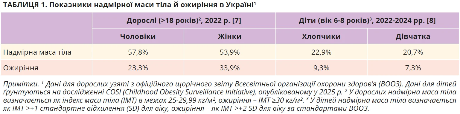 Ожиріння – це поліетіологічна хвороба, зумовлена позитивним енергетичним балансом з надмірним накопиченням жиру та/або патологічним розподілом жирової тканини, що асоціюється з виникненням багатьох коморбідних станів і вкороченням тривалості життя [1-3]. За останні 50 років поширеність ожиріння у світі подвоїлася [4]. Очікується, що до 2030 р. близько половини дорослого населення планети житимуть з надмірною масою тіла чи ожирінням [5]. Останнім часом відзначається також стрімке зростання поширеності ожиріння серед дітей і підлітків [6]. В Україні показники надмірної маси тіла й ожиріння не менш тривожні (табл. 1) [7, 8].