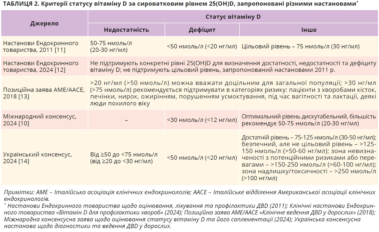 На сьогодні немає єдиного консенсусу щодо порогових значень 25(OH)D для визначення гіповітамінозу D – дефіциту чи недостатності. Різні організації пропонують різні порогові рівні або взагалі відмовляються від конкретизації, вважаючи оптимальними рівні, які не призведуть до остеомаляції в жодного пацієнта чи в 97,5% популяції (табл. 2).