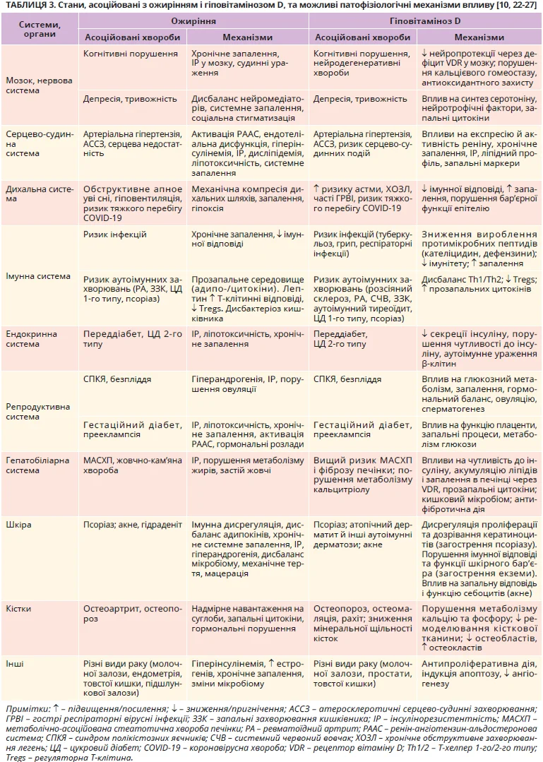 Фізіологічна роль вітаміну D не обмежується гомеостазом кальцію та здоров’ям кісток. Завдяки плейотропним впливам на метаболізм, імунітет, клітинну проліферацію й диференціацію реалізуються протизапальний, антиатерогенний, кардіо- та нейрозахисний ефекти вітаміну D. Окрім ожиріння, гіповітаміноз D тісно пов’язаний з компонентами метаболічного синдрому – артеріальною гіпертензією, дисліпідемією, інсулінорезистентністю та порушеннями обміну глюкози [21]. З іншого боку, ожиріння асоціюється з низкою коморбідних станів, дуже схожих на стани, пов’язані з ДВD [22]. Систематизація патології, що асоціюється з ожирінням і ДВD, та розгляд їхніх патофізіологічних механізмів (табл. 3) демонструють синергічний негативний вплив поєднання ожиріння з ДВD на більшість коморбідних станів.