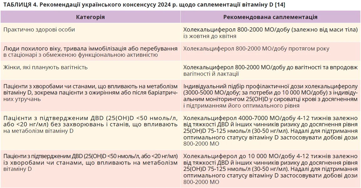 Оприлюднений у 2024 р. Український консенсус щодо діагностики та лікування ДВD у дорослих також відносить осіб з ожирінням до груп ризику ДВD, яким рекомендовано скринінг 25(OH)D. Для профілактики та лікування ДВD рекомендується віддавати перевагу пероральному застосуванню холекальциферолу щоденно або щотижнево; бажане дозування для різних категорій вказано в таблиці 4 [14].