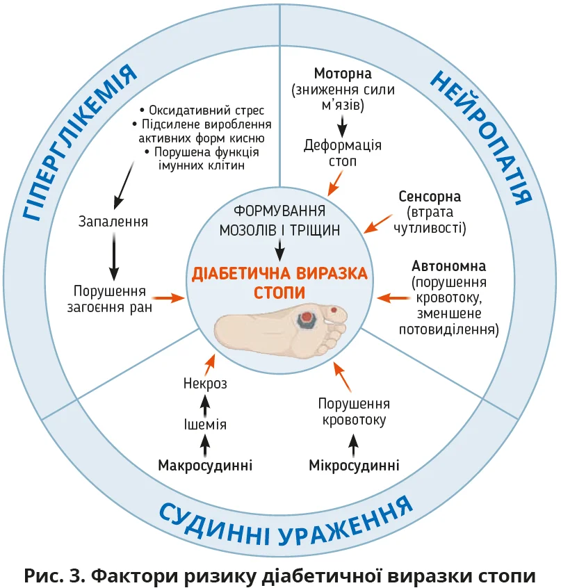 Діабетична виразка стопи (ДВС) є найтяжчим шкірним ускладненням у разі ЦД і виникає внаслідок сукупного впливу периферичної нейропатії, судинної недостатності, інфекцій і порушення регенерації (рис. 3). Погіршення чутливості внаслідок сенсорної нейропатії призводить до того, що незначні травми залишаються непоміченими, а моторна нейропатія змінює біомеханіку стопи, зумовлюючи утворення точок тиску, потовщення шкіри та подальші атрофічні зміни тканин. Вегетативна дисфункція призводить до виникнення сухості й тріщин шкіри, що підвищує ризик виразкування, а гіперглікемія та прогресивна ішемія послаблюють регенеративні процеси. Інфекції можуть призвести до деформації стопи, діабетичної хвороби Шарко, остеомієліту чи гангрени. За даними літератури, 50% діабетичних виразок можуть бути вторинно інфікованими, а до 42% пацієнтів із загоєною ДВС матимуть повторний розвиток виразки протягом 1 року. Близько 75% випадків ДВС завершуються ампутацією кінцівки.
