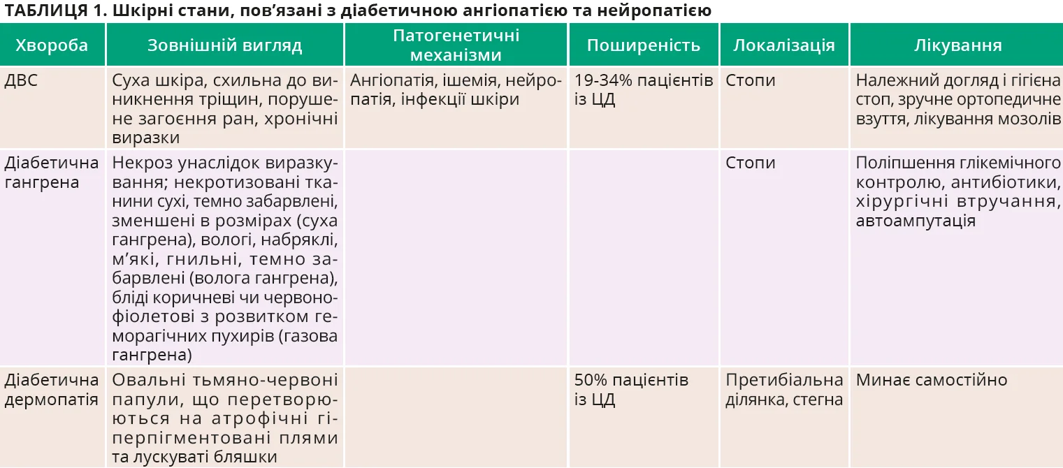 Діабетична дермопатія проявляється виникненням на гомілках, переважно в претибіальній ділянці, овальних тьмяних червонуватих папул, що протягом 1-2 тижнів перетворюються на гіперпігментовані атрофічні плями. Хоча діабетична дермопатія зазвичай безсимптомна та минає самостійно, вона відображає приховану мікроангіопатію й корелює з іншими судинними ускладненнями при діабеті, як-от ретинопатія, нефропатія, нейропатія та серцево-судинні ускладнення. Характеристики найчастіших шкірних проявів діабетичної ангіопатії та нейропатії подано в таблиці 1.