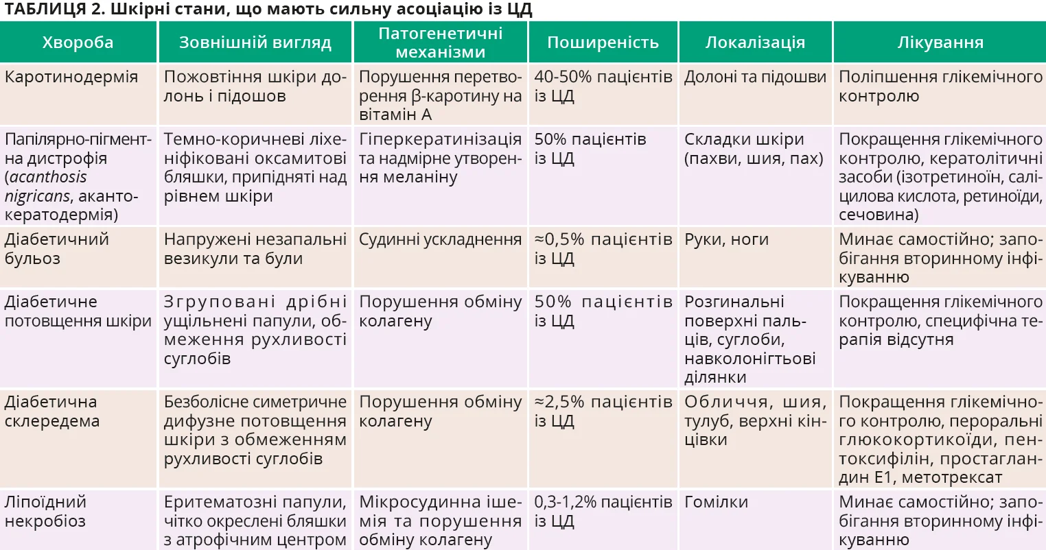 Деякі хвороби шкіри тісно пов’язані з хронічною гіперглікемією й інсулінорезистентністю (табл. 2). Зокрема, каротинодермія проявляється пожовтінням долонь і підошовних ділянок через порушення перетворення каротину на вітамін А, причому іктеричність склер не спостерігається. Папілярно-пігментна дистрофія (acanthosis nigricans, акантокератодермія) є маркером інсулінорезистентності та проявляється симетричним виникненням у ділянках шкірних складок (шия, пахви, пах) темно-коричневих оксамитових ліхеніфікованих бляшок, що припідняті над рівнем шкіри, внаслідок опосередкованої інсуліном проліферації кератиноцитів і фібробластів. Діабетичний бульоз, або пухирчатка, – це рідкісний стан, який характеризується виникненням на кінцівках безболісних пухирів із прозорим умістом, що найчастіше висихають і загоюються самостійно протягом 2-5 тижнів. Виникнення діабетичних бул асоційоване з тривалим перебігом ЦД та мікросудинними ураженнями.