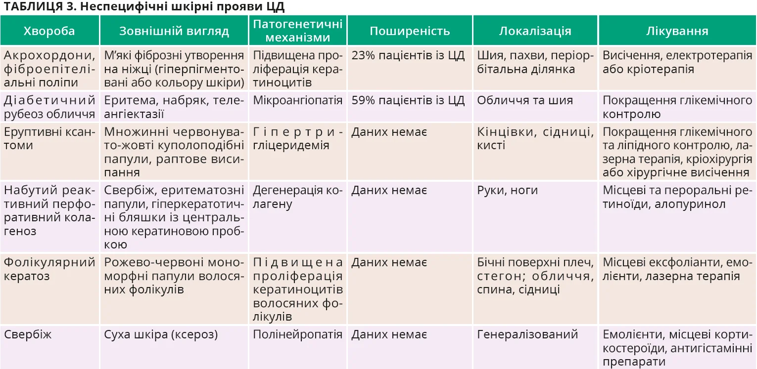 Набутий реактивний перфоративний колагеноз, або набутий перфоративний дерматоз, – це рідкісний шкірний прояв ЦД і хронічної ниркової недостатності, що маніфестує виникненням сверблячих еритематозних папул або гіперкератотичних бляшок із центральною кератиновою пробкою на розгинальних поверхнях кінцівок. Свербіж призводить до розчісування, травмування епідермісу та виникнення нових елементів висипки (феномен Кебнера). Фолікулярний кератоз – це частий доброякісний стан у вигляді рожево-червоних мономорфних папулярних змін волосяних фолікулів; більша частота фолікулярного кератозу при ЦД, імовірно, пов’язана з підвищенням рівнів циркулювальних андрогенів унаслідок гіперінсулінемії. Хронічний свербіж у разі ЦД асоційований із сухістю шкіри (ксерозом), вегетативною дисфункцією та периферичною нейропатією. Характеристики неспецифічних шкірних проявів, асоційованих із ЦД, подано в таблиці 3.