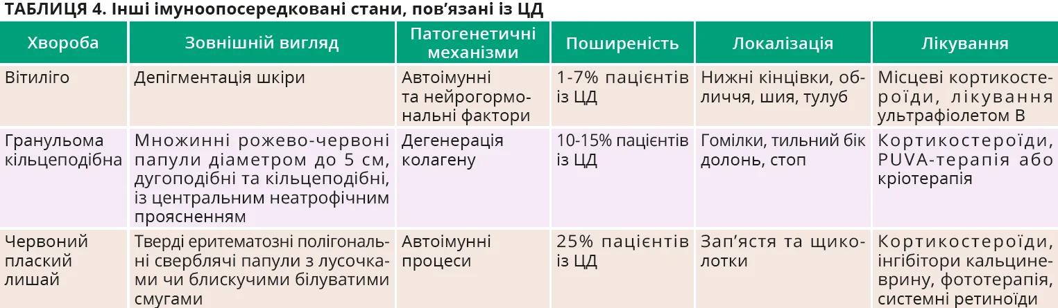 ЦД демонструє асоціацію з виникненням деяких імуноопосередкованих і запальних захворювань шкіри (табл. 4). Вітиліго – автоімунна хвороба, яка проявляється чітко демаркованими гіпопігментованими плямами та часто супроводжує ЦД 1-го типу й інші автоімунні патології. Кільцеподібна гранульома – доброякісний дерматоз, що характеризується виникненням кільцеподібних червоних папул з депігментованим центром переважно на кінцівках; генералізовані форми можуть бути асоційовані із ЦД і передувати його діагностуванню. Червоний плаский лишай – хронічна запальна хвороба шкіри та слизових оболонок, яка часто трапляється в пацієнтів із ЦД і характеризується висипаннями у вигляді сверблячих червоно-фіолетових папул, часто з білими лусочками чи характерними білими смугами (смуги Вікгема), щоможуть з’являтися після механічної травми шкіри (феномен Кебнера).