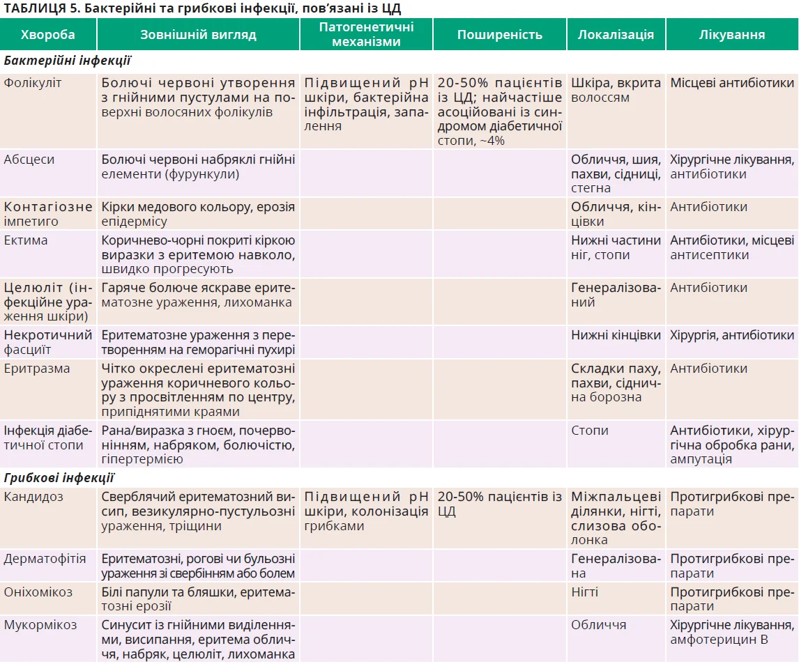 Пацієнти із ЦД мають підвищений ризик приєднання інфекцій шкіри та м’яких тканин через імунну дисфункцію, хронічне запалення, нейропатію, ангіопатію й підвищений рН шкіри. Ці фактори спричиняють зниження сенсорної та больової чутливості, дрібні травми можуть довго залишатися непоміченими, що спричиняє вторинне інфікування. Більш ніж половина пацієнтів із ЦД стикаються з дерматологічними інфекціями, асоційованими з хворобою; поганий контроль глікемії підвищує ризик виникнення та тяжкість перебігу інфекції. Характеристики основних бактерійних і грибкових інфекційних ускладнень ЦД представлено в таблиці 5.