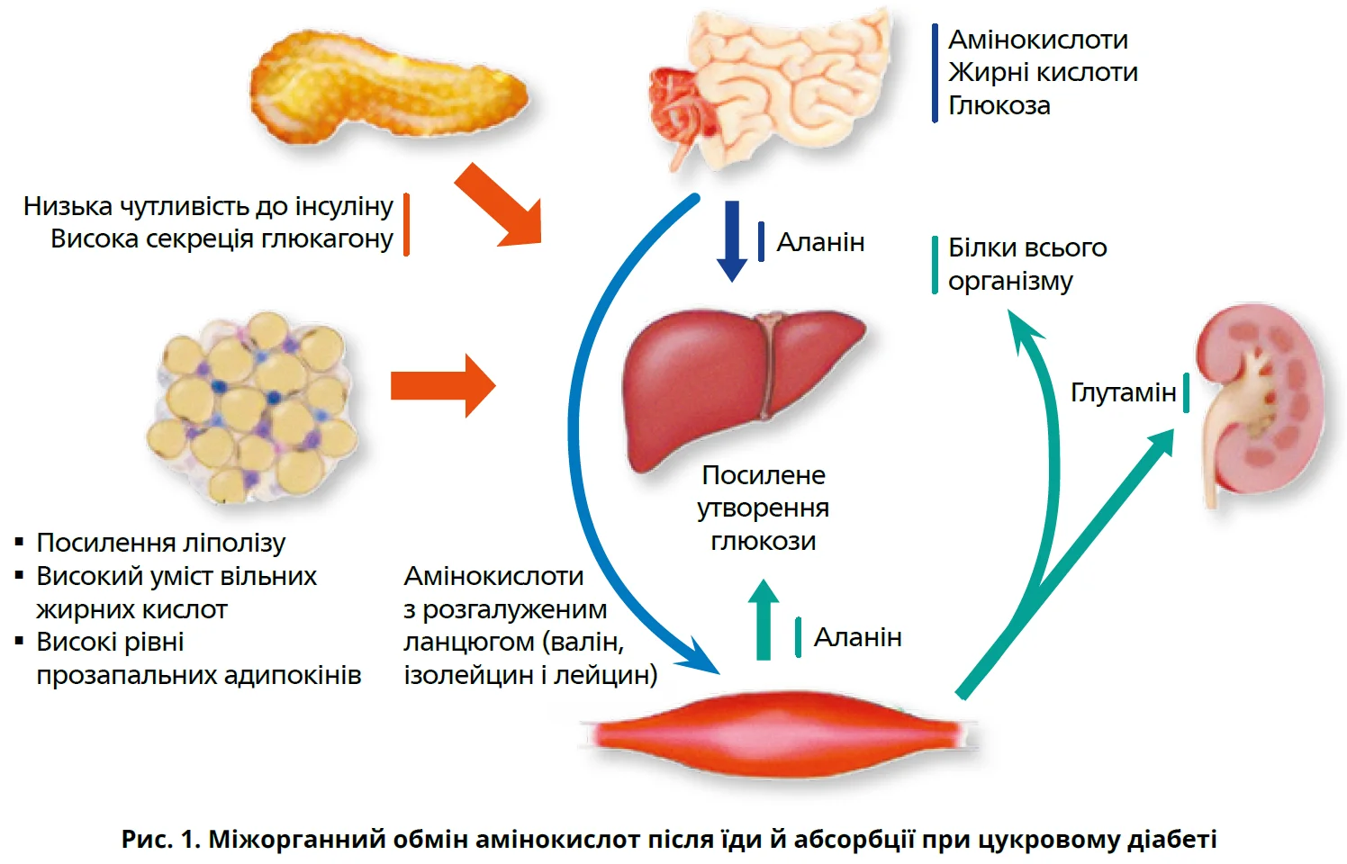 Валін, ізолейцин і лейцин – АМК із розгалуженим ланцюгом – переносять азот на периферію в постпрандіальному стані, минаючи печінку. Протилежну дію чинять аланін і глутамін, які доставляють азот із периферії до печінки, кишківника та нирок (рис. 1). Зниження поглинання АМК із розгалуженим ланцюгом в умовах ІР порушує постачання м’язів і призводить до саркопенії.