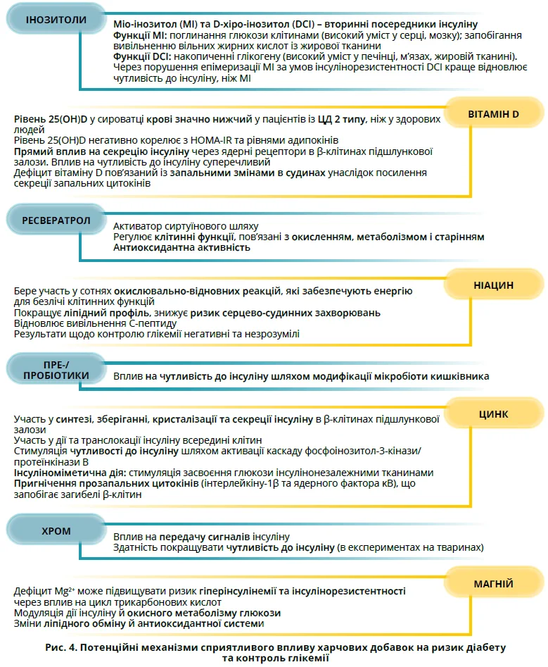 Харчові добавки для метаболічного контролю доволі широко застосовуються в певних країнах. Утім, міжнародні діабетичні товариства не підтримують їх використання при ЦД 2 типу через відсутність доказів і невизначеність щодо безпеки. Певні речовини становлять інтерес. Їх передбачувані механізми дії узагальнено на рисунку 4.