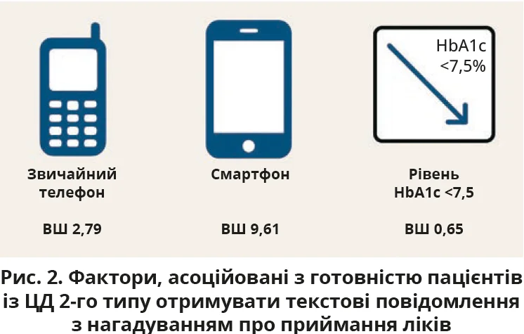 Було оцінено готовність літніх амбулаторних пацієнтів із ЦД 2-го типу використовувати мобільні телефони для підтримки дотримання режиму приймання ліків за допомогою текстових повідом­лень [1].