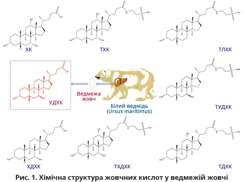 Основу ведмежої жовчі становлять жовчні кислоти, амінокислоти, білки, жовчні пігменти, мінеральні елементи тощо. Найважливішою активною частиною є жовчні кислоти, основними з яких є УДХК, тауроурсодезоксихолева кислота (ТУДХ), таурохенодезоксихолева кислота (ТХДХК), хенодезоксихолева кислота (ХДХК), тауродезоксихолева кислота (ТДХК), тауролітохолева кислота (ТЛХК), холева кислота (ХК), таурохолева кислота (ТХК) (рис. 1). У натуральній ведмежій жовчі основні жовчні кислоти присутні в таких кількісних співвідношеннях: ТУДХК – 51,25±11,38%, ТХДХК – 25,45±8,63%, УДХК – 18,17±0,80%, ХДХК – 15,17±0,42%.