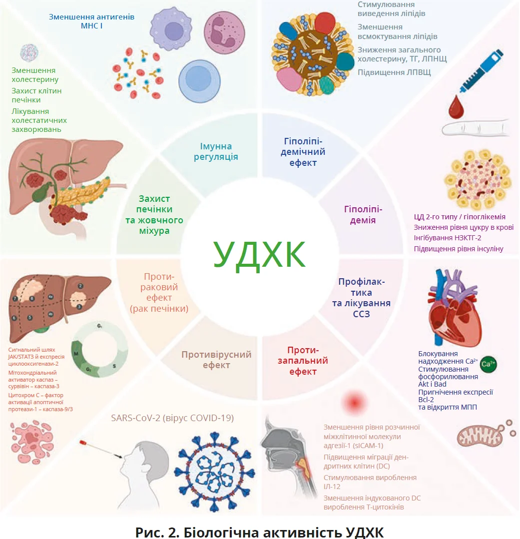 УДХК проявляє численні гепатопротекторні властивості шляхом зміни складу жовчних кислот: зменшує кількість токсичних гідрофобних кислот і водночас підвищує рівень нетоксичних гідрофільних. Вона також посилює жовчовиділення та демонструє цитопротекторну, антиапоптотичну й імунорегуляторну дії (рис. 2). Лікування УДХК здатне значно покращувати порушені показники функції печінки при різних холестатичних станах, включно з первинним склерозивним холангітом, внутрішньопечінковим холестазом вагітних, хворобами печінки, пов’язаними з муковісцидозом, реакцією «трансплантат проти господаря» з ураженням печінки, холестазом, індукованим парентеральним харчуванням, а також деякими дитячими холестатичними розладами.