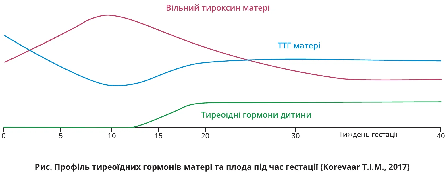 Під час вагітності фізіологія ЩЗ змінюється. Вже через 11 днів після зачаття зростає рівень хоріонічного гонадотропіну людини, який сприяє збереженню та підтримці вагітності, в тому числі забезпеченню належного постачання материнських тиреоїдних гормонів плоду, який не виробляє достатньої кількості власних приблизно до середини другого триместру (рис.).