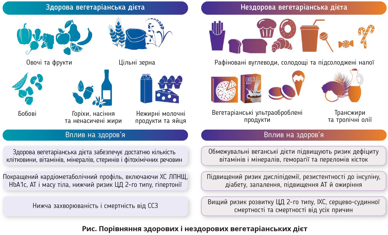 Водночас не всі продукти рослинного походження однаково корисні. Доведено, що вегетаріанські дієти, багаті на рафіноване борошно, гідрогенізовані олії, кукурудзяний сироп з високим умістом фруктози, сахарозу, штучні підсолоджувачі, сіль і консерванти, збільшують захворюваність і смертність (рис.).