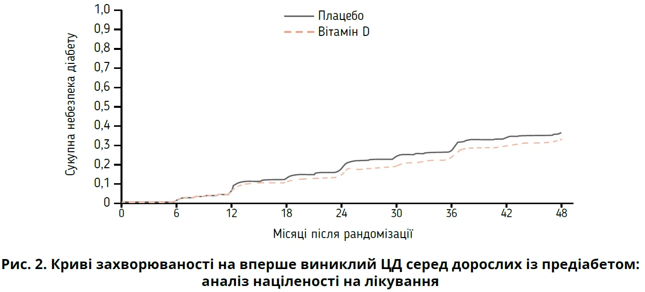 Після поправки на початковий вік, стать, ІМТ, расу та рівень глікованого гемоглобіну коефіцієнт ризи-ку для вітаміну D становив 0,85 (ДІ 0,75-0,96). Абсолютне зниження ризику для вітаміну D порівняно з плацебо становило 3,3% (ДІ 0,6-6,0%), а кількість, яку потрібно було лікувати, – 30.