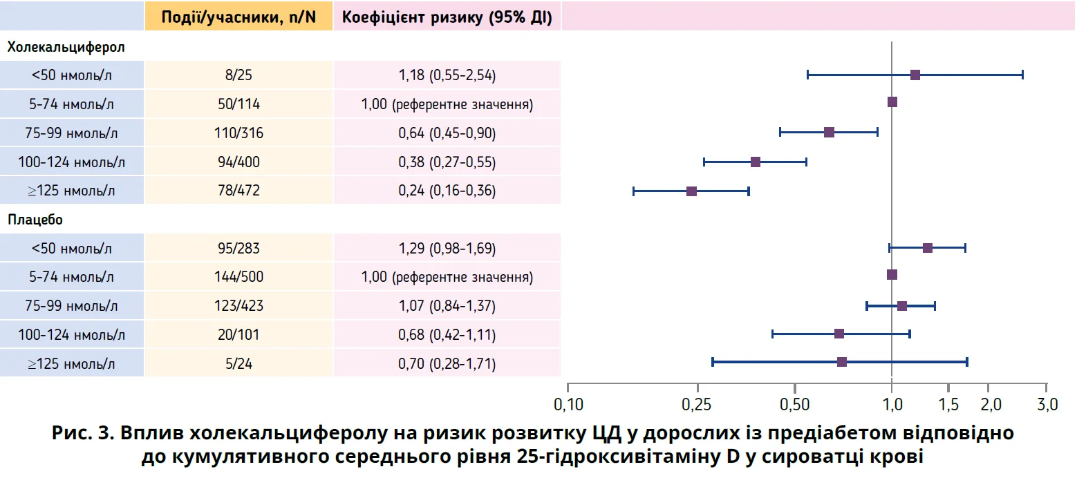 Абсолютне зниження ризику через 3 роки становило 11,4% (ДІ 4,6-18,3%) та 18,1% (ДІ 11,7-24,6%) відповідно. Серед учасників, які приймали плацебо, коефіцієнти ризику розвитку ЦД за кумулятивним середнім значенням сироваткового 25-гідроксивітаміну D у ході дослідження не були статистично значущими (рис. 3).