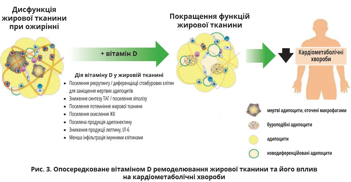 Крім того, 1,25(OH)2D3 пригнічує прозапальні сигнальні шляхи в адипоцитах 3T3-L1 та імунних клітинах, зменшує запалення жирової тканини, впливаючи на імунні клітини, які експресують VDR. Вітамін D оновлює жирову тканину, прискорюючи утворення адипоцитів шляхом рекрутингу та диференціації стовбурових клітин, що сприяє заміні мертвих адипоцитів і посиленню здатності адипоцитів накопичувати ліпіди. Комплекс вітамін D – VDR покращує функції жирової тканини: посилює окислювальний метаболізм; зумовлює потемніння; зменшує запалення; посилює ендокринні властивості жирової тканини. Завдяки здоровому ремоделюванню жирової тканини вітамін D може знизити ризик КМЗ (рис. 3).