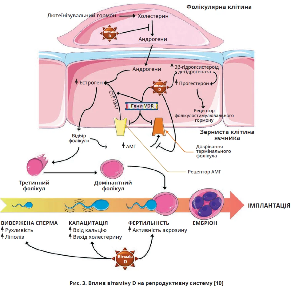 Зазнали значних змін уявлення щодо його метаболізму: доведено, що після всмоктування в кишківнику або утворення в шкірі вітамін D зв’язується з багатофункціональним білком переносником (вітамін-D-зв’язувальний білок – ВDЗБ), який транспортує його в печінку, де під час гідроксилювання останній трансформується у 25-гідроксивітамін D3 (25-(OH)D3) – основну форму, що використовується організмом для циркуляції та зберігання вітаміну D. Під час наступного етапу метаболізму, який відбувається в нирках, 25-(OH)D3 перетворюється на 1,25-(OH)2D3 (кальцитріол). Свій гормоноподібний вплив на організм ця біологічно активна форма чинить шляхом зв’язування зі спеціальними рецепторами, розташованими на поверхні клітин – вітамін-D-зв’язувальними рецепторами (VDR) [7]. Проводячи експериментальні дослідження, вчені сподівалися виявити VDR у «класичному» місці (в ентероцитах і, можливо, колоноцитах), але знайшли їх у дуже «нетрадиційних» локаціях: кератиноцитах, промієлоцитах, моноцитах, лімфоцитах, острівках підшлункової залози та навіть в ооцитах і сперматозоїдах, яєчниках і яєчках, ендометрії, плаценті та трофобласті [7]. Нині переконливо доведено, що недостатність вітаміну D у чоловіків призводить до гіпогонадизму та зниження фертильності, у жінок – спричиняє розвиток синдрому полікістозних яєчників (СПКЯ), ендометріозу, лейоміозу, впливає на перебіг вагітності, утруднює природне запліднення та підвищує ймовірність екстракорпорального запліднення (ЕКЗ) [18].