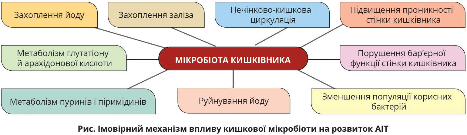 Механізм впливу мікробіоти кишківника на розвиток і перебіг АІТ досі вивчається. Імовірно, взаємодія між мікробами й організмом-господарем опосередкована такими мінералами, як селен, залізо, цинк, які впливають на рівні тиреоїдних гормонів. Окрім того, кишкова мікробіота продукує власні антигени, що можуть зумовлювати порушення цілісності міжклітинних контактів, надходити в системний кровообіг і, відповідно, призводити до формування прозапального тла й розвитку автоімунних процесів, зокрема в ЩЗ.