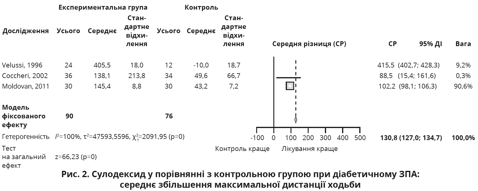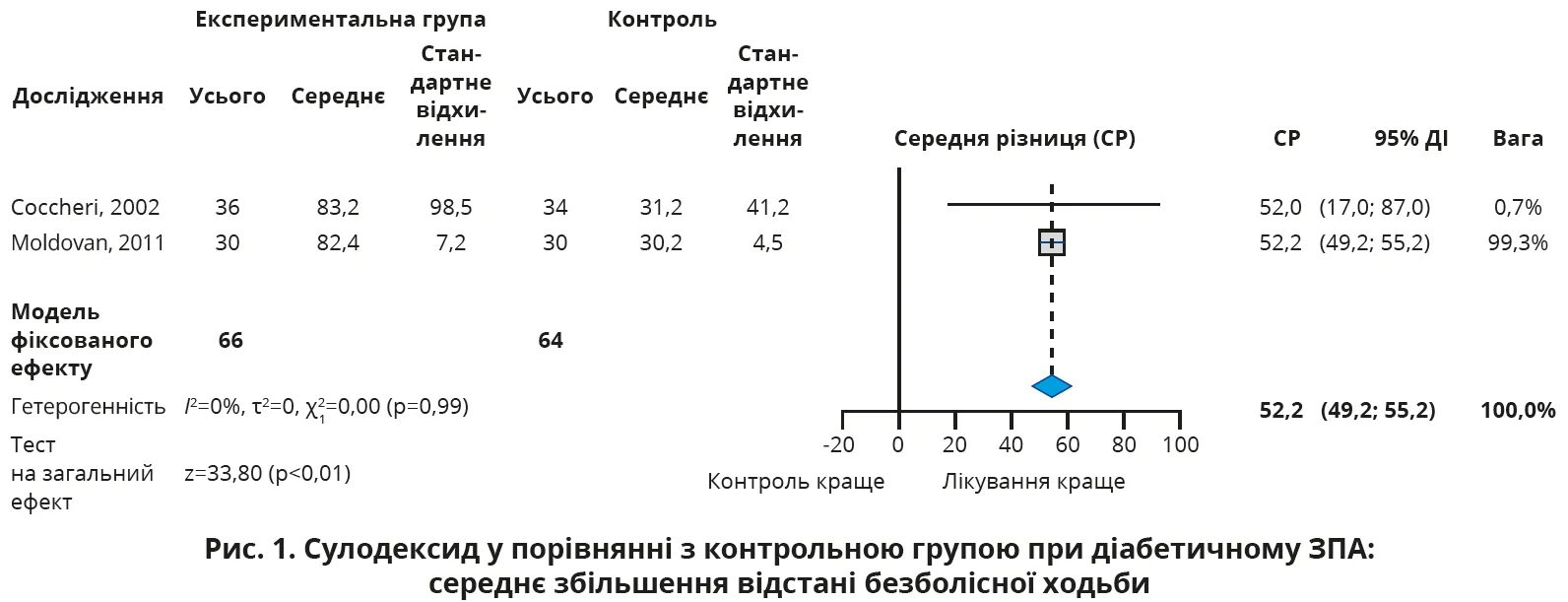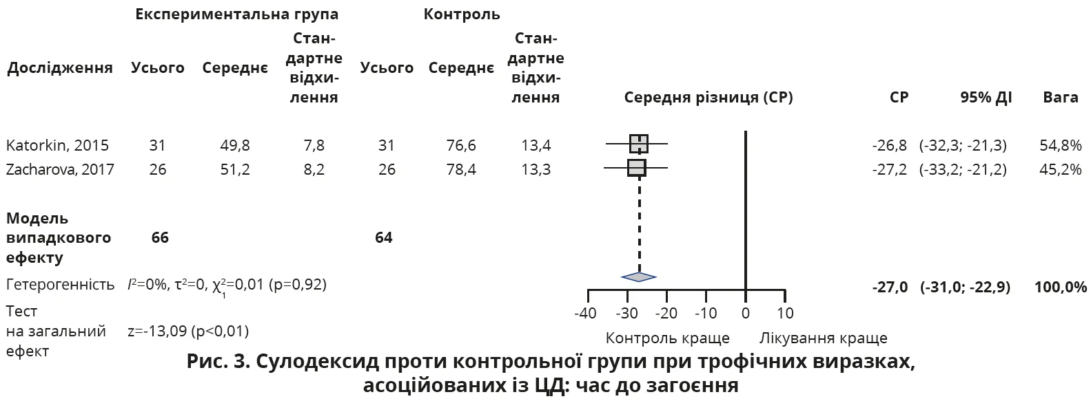 Загоювання трофічних виразок у пацієнтів, які отримували сулодексид, відбувалося в середньому на 27 днів раніше (95% ДІ 23-31; p<0,01), ніж в учасників контрольної групи (рис. 3).