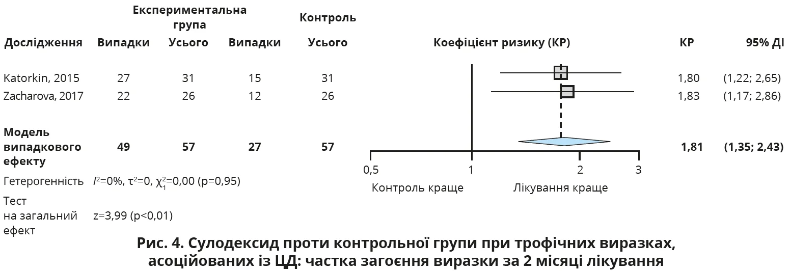 Щодо частки загоєння виразки протягом 2 місяців лікування, то пацієнти, які отримували сулодексид, мали ймовірність покращення стану в 1,8 раза (95% ДІ 1,4-2,4) більшу, ніж суб’єкти в контрольній групі (p<0,01; рис. 4).