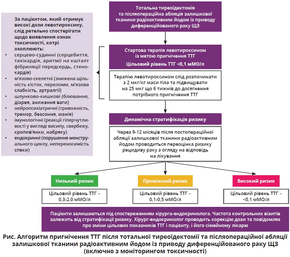У пацієнтів, які перенесли тотальну тиреоїдектомію з приводу диференційованого раку ЩЗ, спочатку проводять стратифікацію ризику відповідно до модифікованих рекомендацій Американської тиреоїдної асоціації. Після цього багатодисциплінарна команда ухвалює рішення щодо потреби післяопераційної абляції залишкової тканини радіоактивним йодом. У пацієнтів, які пройшли цю процедуру, хірург ініціює терапію левотироксином у дозах, що забезпечують пригнічення ТТГ до рівня <0,1 мМО/л. Початкова доза становить 2 мкг на кілограм маси тіла. Хірургу-ендокринологу також варто проінформувати сімейного лікаря пацієнта про потребу пригнічення ТТГ та індивідуальні цільові рівні цього гормону.