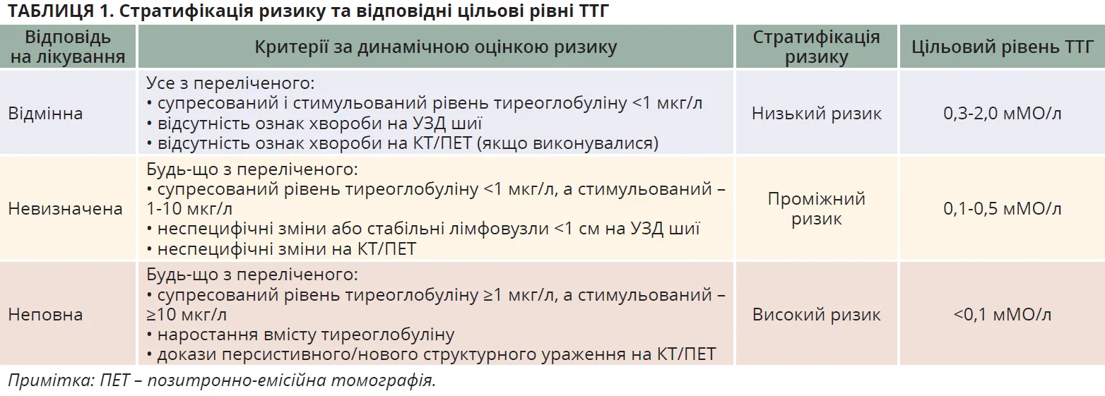 Через 9-12 місяців після постопераційної абляції залишкової тканини радіоактивним йодом проводиться переоцінка ризику рецидиву раку за допомогою динамічної стратифікації ризику. У багатьох пацієнтів хвороба добре піддається лікуванню, що зменшує необхідність у пригніченні ТТГ. Динамічна стратифікація ризику враховує три основні показники ефективності лікування: рівень тиреоглобуліну, результати ультразвукового дослідження (УЗД) шиї та дані комп’ютерної томографії (КТ) або радіонуклідної візуалізації (за наявності). Відповідно до цих чинників пацієнтів поділяють на три категорії: відмінна відповідь (низький ризик), невизначена відповідь (проміжний ризик) і неповна відповідь (високий ризик). Залежно від рівня ризику корегується потрібний ступінь пригнічення ТТГ, а отже, доза левотироксину. Визначення кожної групи ризику й відповідні цільові рівні ТТГ наведено в таблиці 1, а загальний огляд основних етапів ініціації терапії та корекції дози левотироксину – на рисунку.