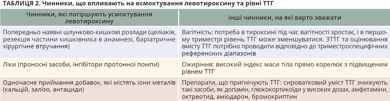 Часто випадки недостатнього пригнічення ТТГ спричинені неправильним часом приймання левотироксину, що призводить до недостатнього кишкового всмоктування. Деякі лікарські засоби (наприклад, сульфат заліза, карбонат кальцію), продукти харчування та дієтичні добавки також можуть взаємодіяти з левотироксином, впливаючи на його абсорбцію й ефективність. Пацієнтам слід рекомендувати приймати левотироксин натщесерце, зранку, за 30-60 хвилин до вживання будь-яких інших ліків, кофеїновмісних напоїв або сніданку. Лікарям також варто звертати увагу на численні фактори, які можуть впливати на потребу в ЗТТГ. Основні з них узагальнені в таблиці 2 й охоплюють вагітність, зміну маси тіла та стани, що супроводжуються мальабсорбцією.