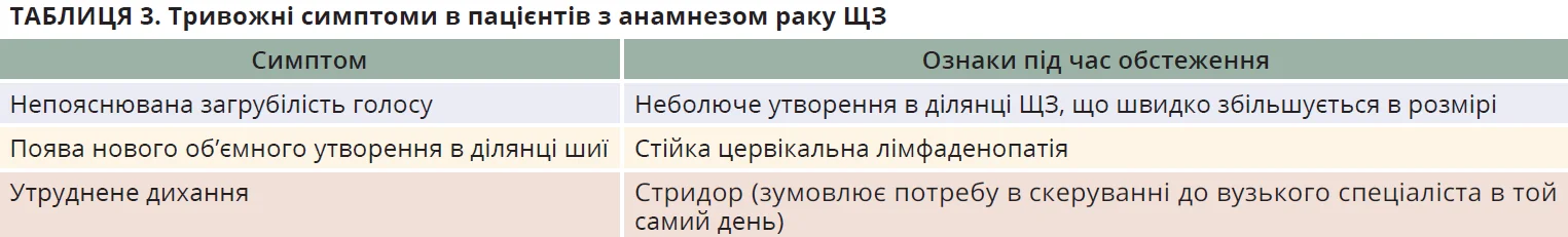 Якщо в пацієнта спостерігаються симптоми з боку голови та шиї, що можуть указувати на можливий рецидив раку ЩЗ, треба провести цільове клінічне обстеження та перевірити наявність тривожних симптомів (табл. 3). Їх наявність має стати підставою для термінового скерування до хірурга-ендокринолога, який проведе подальші дослідження, зокрема УЗД та визначення рівня тиреоглобуліну.