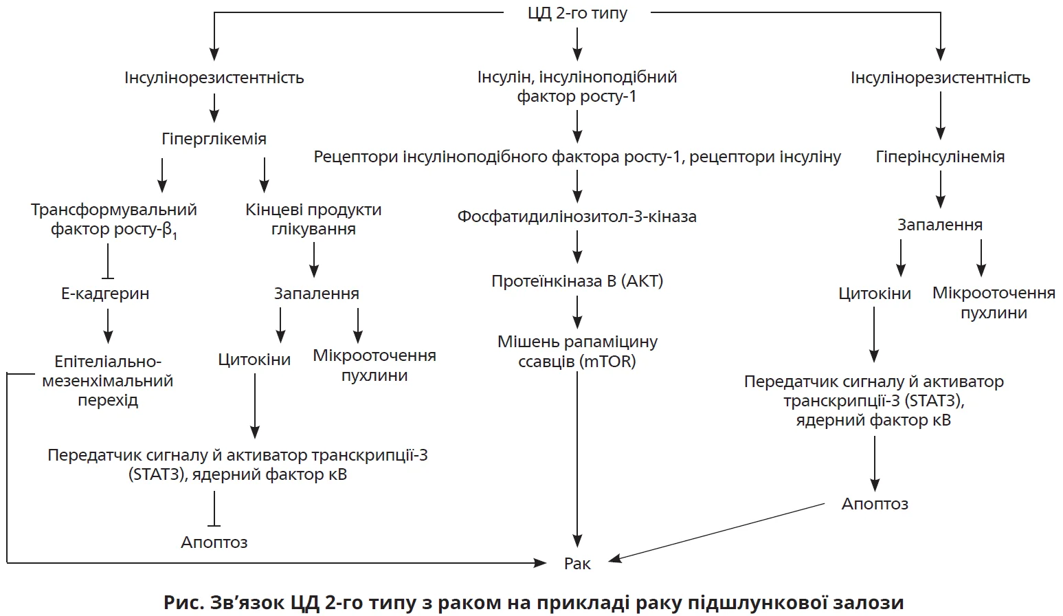 ЦД асоціюється з ожирінням, інсулінорезистентністю (ІР), гіперглікемією, хронічним запаленням тощо, які, своєю чергою, пов’язані зі злоякісними новоутвореннями. Крім того, деякі протидіабетичні препарати можуть стимулювати розвиток раку (рис.).
