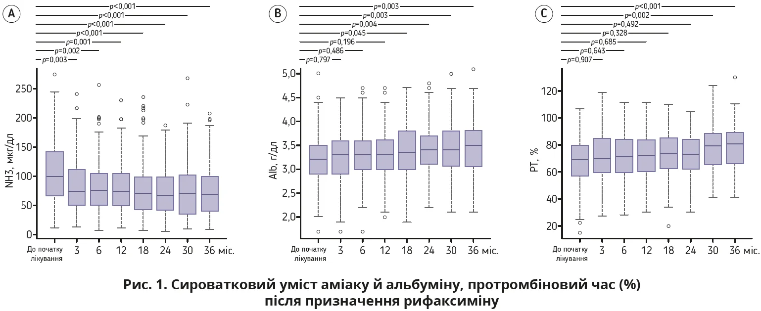 А – аміак (NH3, мкг/дл). Рівень аміаку значно знизився на тлі лікування рифаксиміном: від 100,0 (66,5-141,5) мкг/дл на початковому етапі до 74,0 (49,8-111,3), 75,4 (49,5-105,0), 74,4 (48,5-105,0), 70,2 (42,0-99,0), 67,0 (41,0-99,0), 70,0 (35,3-97,5) та 69,0 (40,0-99,8) мкг/дл через 3, 6, 12, 18, 24, 30 і 36 місяців відповідно. Статистично значущі відмінності спостерігали між вихідним рівнем і показниками після 3 місяців лікування та далі. В – альбумін (Alb, г/дл). Рівні сироваткового альбуміну значно підвищилися на тлі лікування рифаксиміном: від 3,2 (2,9-3,5) г/дл на початку до 3,3 (2,9-3,6), 3,3 (3,0-3,6), 3,3 (3,0-3,6), 3,4 (3,0-3,8), 3,4 (3,1-3,7), 3,4 (3,1-3,8) та 3,5 (3,1-3,8) г/дл через 3, 6, 12, 18, 24, 30 і 36 місяців відповідно. Статистично значущі відмінності спостерігали між вихідним рівнем і показниками після 3 місяців лікування та далі. С – протромбіновий час (PT, %). Активність протромбіну значно підвищилася на тлі лікування рифаксиміном: від 69,0% (57,0-80,1) на початку до 69,5 (59,0-84,3), 71,0 (59,4-84,2), 72,0 (60,0-83,7), 73,0 (62,2-84,0), 72,8 (62,0-84,0), 79,0 (64,6-88,7) та 80,6% (66,1-89,1) через 3, 6, 12, 18, 24, 30 і 36 місяців відповідно. Статистично значущі відмінності спостерігали між вихідним рівнем і показниками після 3 місяців лікування та далі.