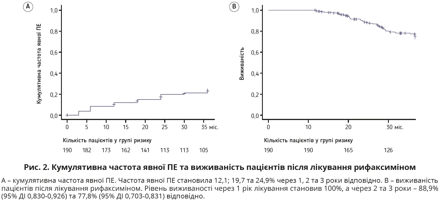 Дані представлено у вигляді медіана ± міжквартильний розмах; для порівняння безперервних змінних на вихідному етапі та після призначення рифаксиміну через 3, 6, 12, 18, 24, 30 і 36 місяців застосовували дисперсійний аналіз з повторними вимірюваннями з подальшим порівнянням результатів між точками спостереження. Загальну виживаність оцінювали методом Каплана – Меєра, під «подією» розуміли летальний випадок; для аналізу кумулятивної частоти виникнення ПЕ застосовували тест Грею. Значення p<0,05 вважали статистично значущим.